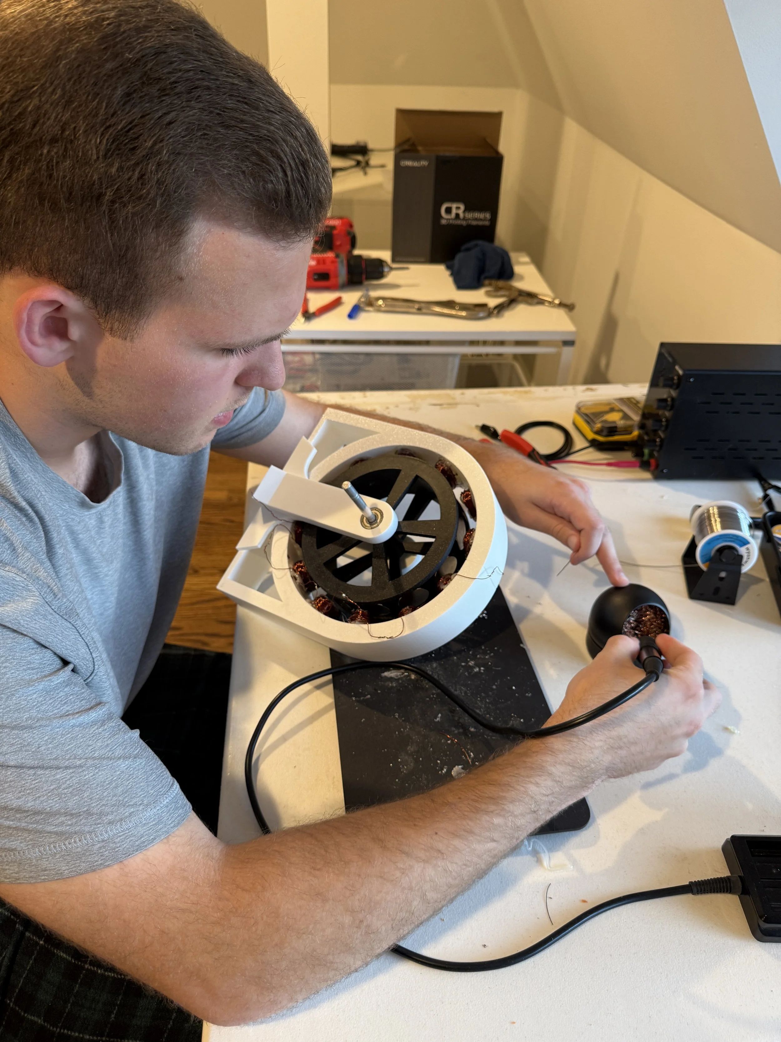 Project overview: I built this project to apply my understanding of electromagnetic induction while pushing my CAD modeling skills to create parts that interface precisely with real-world components like magnets, wire coils, and bearings. Inspired by a large-scale wooden alternator on otherpower.com, I created my own fully custom 3D model to accommodate the specific magnets and geometry I was working with. Along the way, I had to learn detailed design considerations—such as coil winding direction, whether to connect coils in series or parallel, and how to maximize flux changes through the coils. This project gave me hands-on experience with the full engineering process, from concept and CAD modeling to fabrication, assembly, and electrical testing.