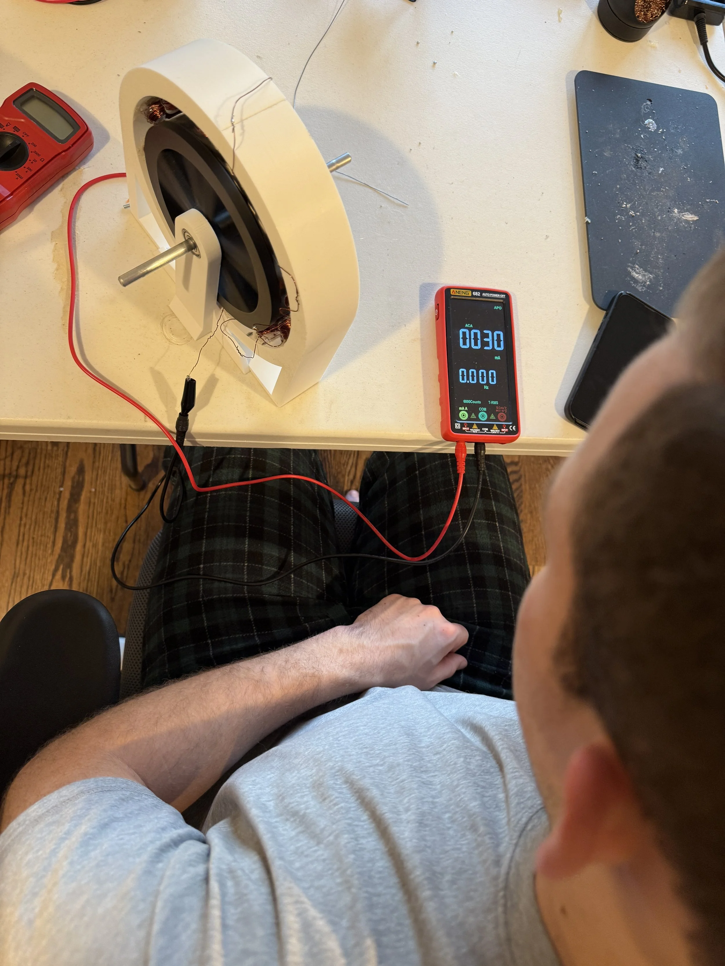 Summary: A custom-designed hand-crank generator built around the principles of electromagnetic induction. I fully designed, modeled, iterated, 3D-printed, assembled, and tested the device myself. The generator uses twelve magnet-wire coils mounted around a circular chassis and a rotating magnetic core at the center. When spun with a drill, it produces approximately 50 mA at 20 mV.